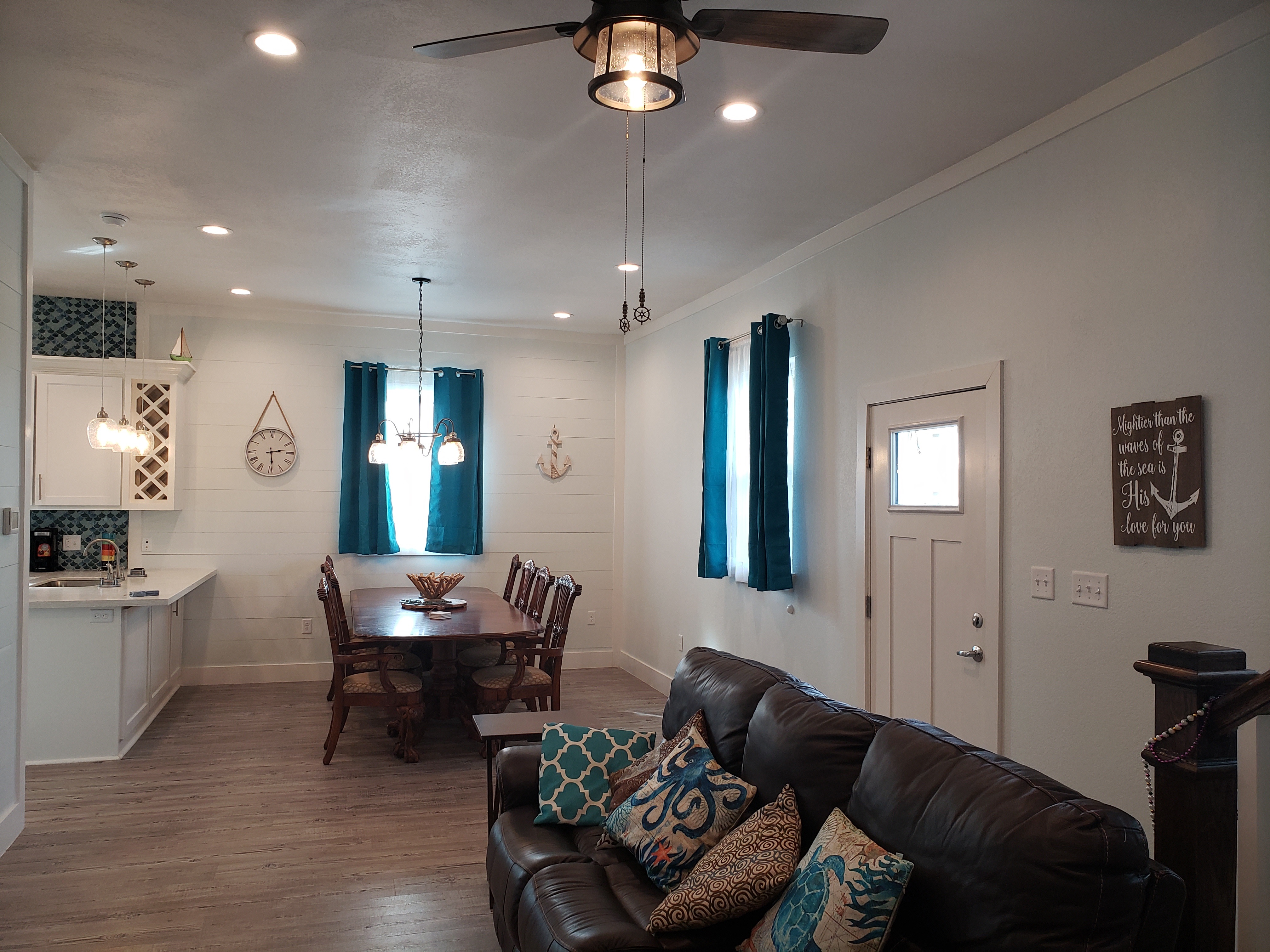 Welcome to Sea-Esta Vacation Beach House on Galveston Island. Come let Sea-Esta be your home, away from home! See the beach from the 2nd floor deck or enjoy the gulf breeze from either of the front porches. Sea-Esta is now a completely renovated 2 story home, after a complete facelift in 2020. This beach bungalow began as a century old 2-bedroom, 1 bath and was raised adding 2 bedrooms, 2 baths, a second kitchen, 2 porches and upstairs deck with beach views! A living area, dining area, 2 kitchens, 4 bedrooms, 3 baths fill this approximately 2000 square foot home with state-of-the-art finishes pleasing to the senses! Breezy porches, located on the front of the house, upstairs and down. Back deck with a beach view and picnic table. On the first level is the open concept living area, dining area, one kitchen, well stocked with cookware and dinnerware with an open concept layout, beach decor and colors; soothing to the soul! A master bedroom located on the 1st floor with a king bed and bunk set with a twin on top and full on bottom. The remarkably finished master bathroom features a walk-in shower built with ease of access in mind, double shower heads; one being a rain shower head and 2 vanities. The second full bathroom and full-size, stacked washer/dryer are located along the back hall. The 2nd level offers 3 bedrooms, 1 bath and the 2nd kitchen. The orange bedroom has private access to the wrap around front porch sleeps 5 comfortably with a queen bed and a pyramid bunk. The green room sleeps 2 with queen bed. The blue room sleeps 4 with 2 queen beds. The 3rd full bathroom with a tub/shower combo is situated within a few steps from each of the bedrooms on the 2nd floor. The home sleeps 12 adults and 4 children, a maximum of 16, comfortably and in beds. Amenities include central air/ heat, Wi-Fi, Roku/ Smart TV's with the latest and greatest apps and Broadcast Digital TV in the living area, all 4 bedrooms and upstairs kitchen, DVD players in 3 of the bedrooms. A ramp built off the back door allows the home to accommodate wheelchairs and walkers up to 25 inches in width. Covered carport and additional street parking. Two fully equipped kitchens well stocked with all the cook and dinnerware you'll need to prepare that special cuisine or enjoy the simple hamburgers and hot dogs on the charcoal grill. Sea-Esta is located in-town Galveston only 1 1/2 blocks to the beach and 5 blocks to the Pleasure Pier. We are one block from the seawall for swimming and surf lessons, shopping, dining, and more. Check out our photo albums and make your vacation a Sea-Esta. We look forward to hosting you!